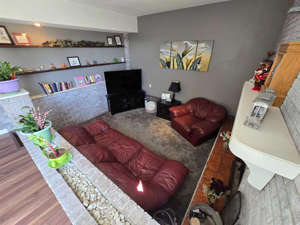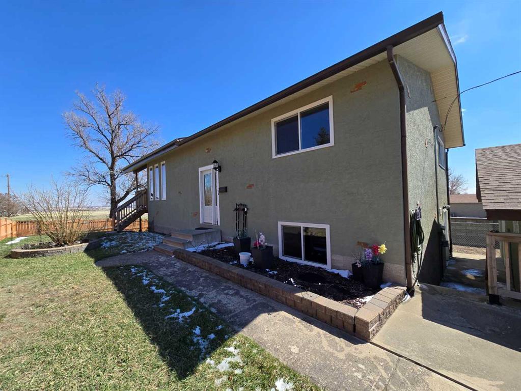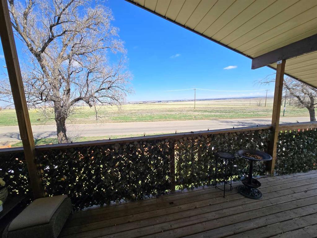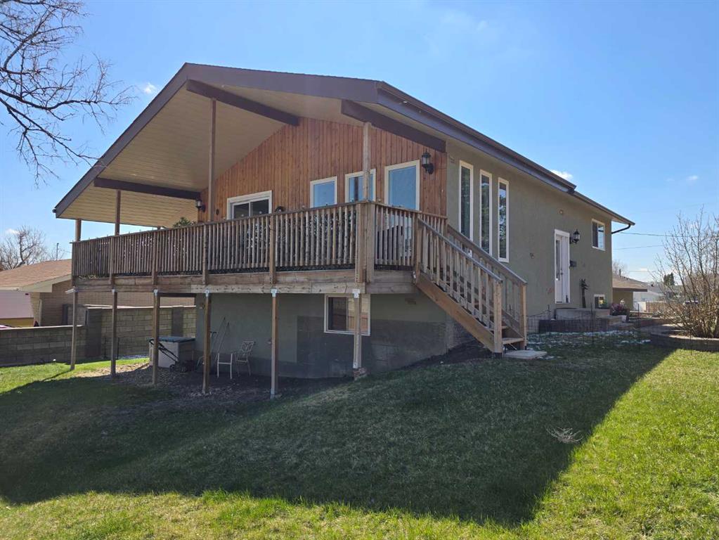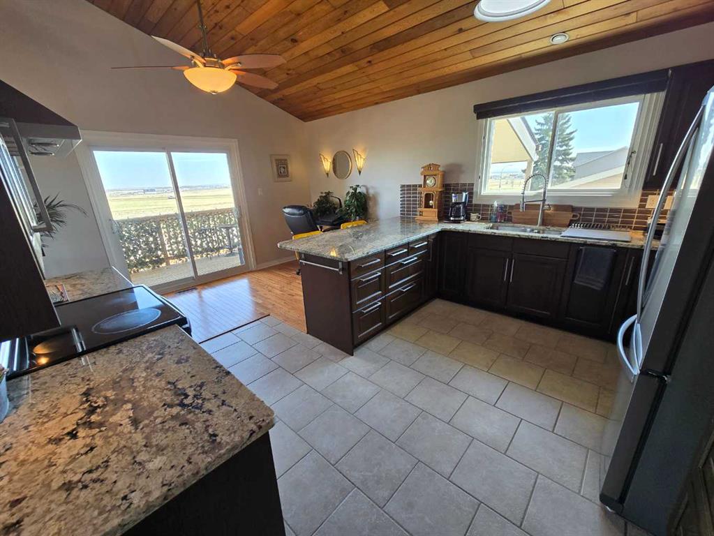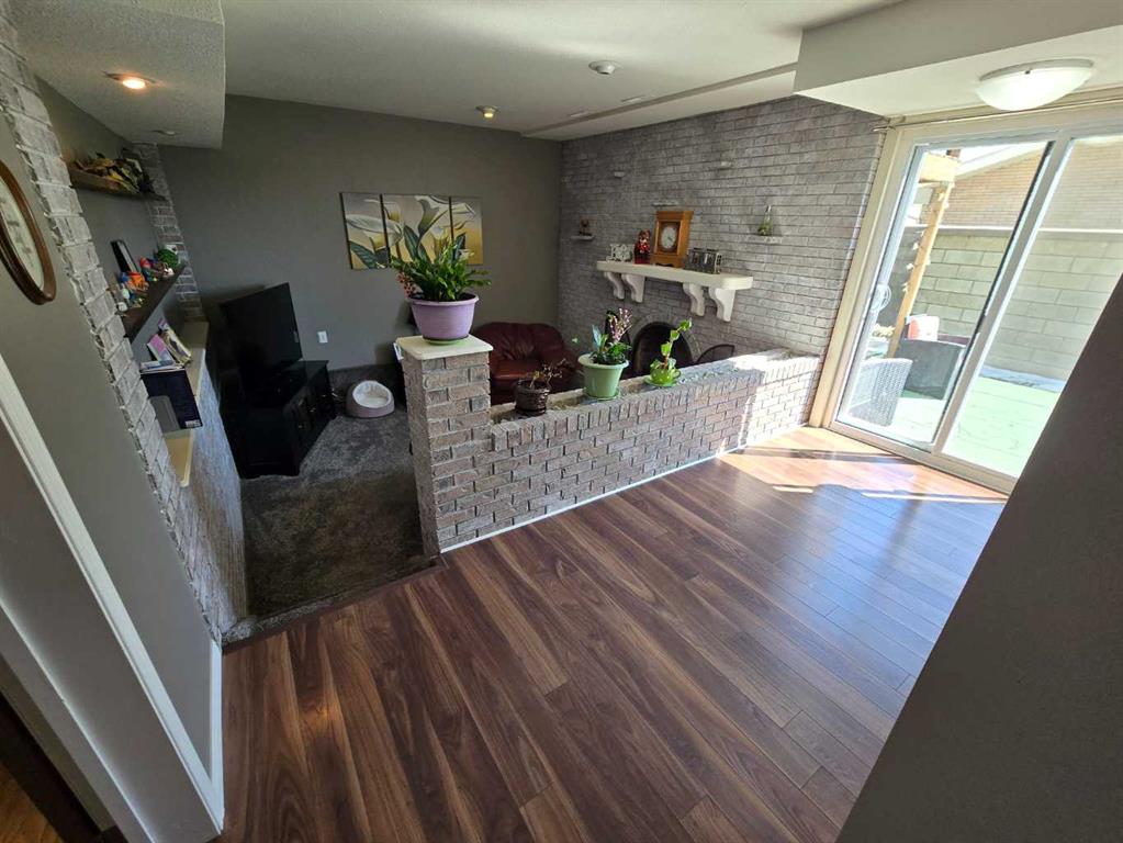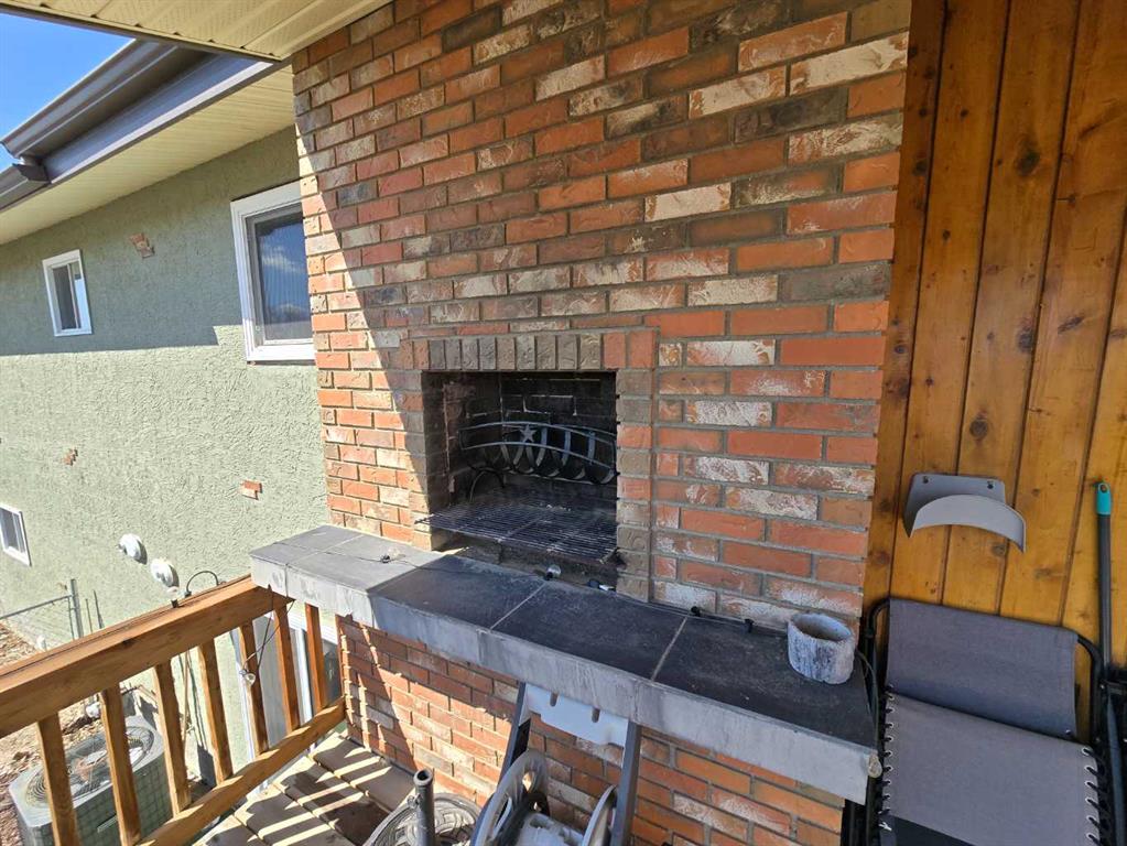 Stunning walkout bungalow with incredible views and standout character! This well-maintained 1979 home offers a bright and open main level with vaulted wood ceilings flowing through the living room, dining area, and kitchen, creating a warm and inviting space full of natural light. The updated kitchen features granite countertops, ample cabinetry, and a functional layout ideal for everyday living and entertaining. The main floor includes two bedrooms and a beautifully updated bathroom complete with a tiled shower and separate soaker tub. The fully developed walkout basement offers excellent flexibility with a second kitchen, spacious family room with brick feature wall, two large bedrooms, and a bathroom with jetted tub. With its own entrance near the garage as well as patio access, this space is perfect for extended family, a mother-in-law setup, or future suite potential. Step outside to a large wrap-around deck spanning the width of the home, complete with a built-in brick fireplace/BBQ—an ideal spot to take in the unobstructed views toward Medicine Hat and beyond, with no neighbours directly in front. Additional features include a 26’ x 28’ double detached garage with finished interior and electric heater, double concrete driveway plus extra parking, underground sprinklers, and a spacious yard. The exterior offers a combination of stucco and wood siding for added character. Additional updates and features include hardwood flooring, a high-efficiency furnace (2024), tankless hot water system (2023), and many vinyl windows, with only a few original aluminum windows remaining. A truly unique property offering space, versatility, and spectacular views—far from cookie-cutter.