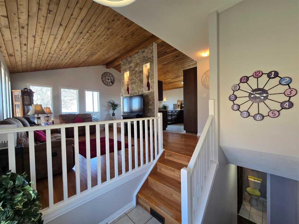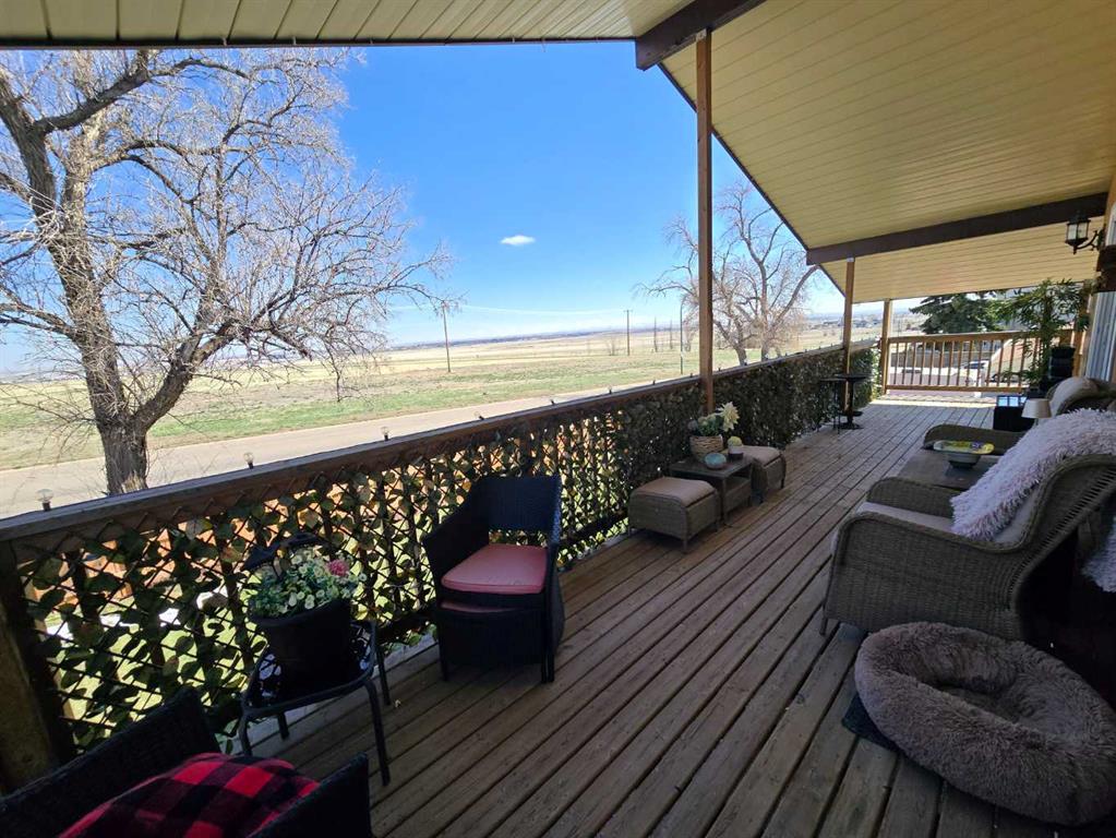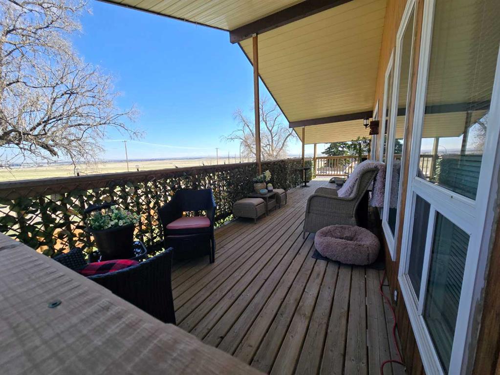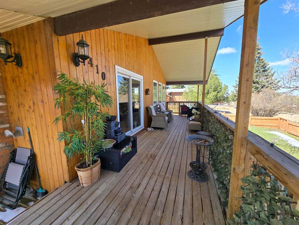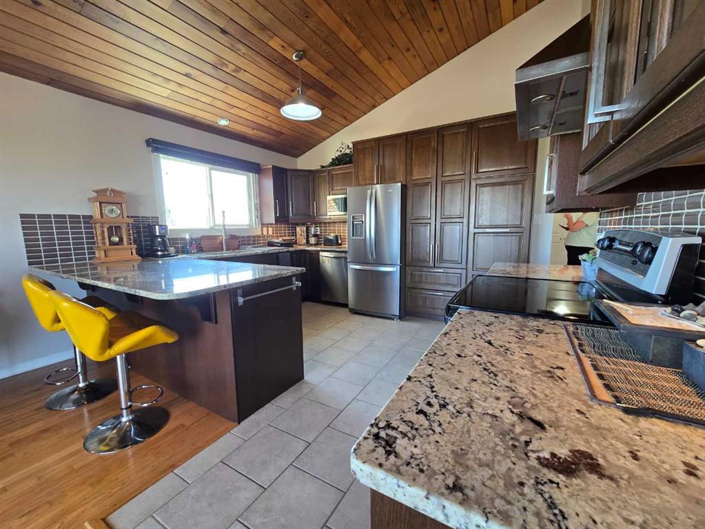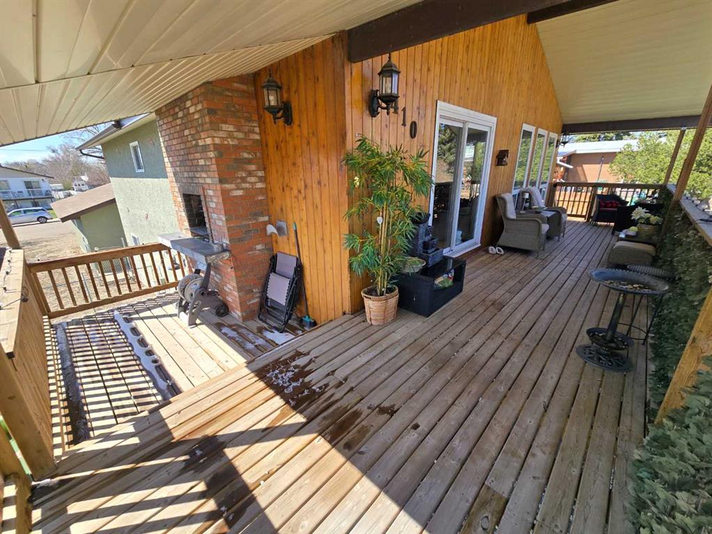 Stunning walkout bungalow with incredible views and standout character! This well-maintained 1979 home offers a bright and open main level with vaulted wood ceilings flowing through the living room, dining area, and kitchen, creating a warm and inviting space full of natural light. The updated kitchen features granite countertops, ample cabinetry, and a functional layout ideal for everyday living and entertaining. The main floor includes two bedrooms and a beautifully updated bathroom complete with a tiled shower and separate soaker tub. The fully developed walkout basement offers excellent flexibility with a second kitchen, spacious family room with brick feature wall, two large bedrooms, and a bathroom with jetted tub. With its own entrance near the garage as well as patio access, this space is perfect for extended family, a mother-in-law setup, or future suite potential. Step outside to a large wrap-around deck spanning the width of the home, complete with a built-in brick fireplace/BBQ—an ideal spot to take in the unobstructed views toward Medicine Hat and beyond, with no neighbours directly in front. Additional features include a 26’ x 28’ double detached garage with finished interior and electric heater, double concrete driveway plus extra parking, underground sprinklers, and a spacious yard. The exterior offers a combination of stucco and wood siding for added character. Additional updates and features include hardwood flooring, a high-efficiency furnace (2024), tankless hot water system (2023), and many vinyl windows, with only a few original aluminum windows remaining. A truly unique property offering space, versatility, and spectacular views—far from cookie-cutter.