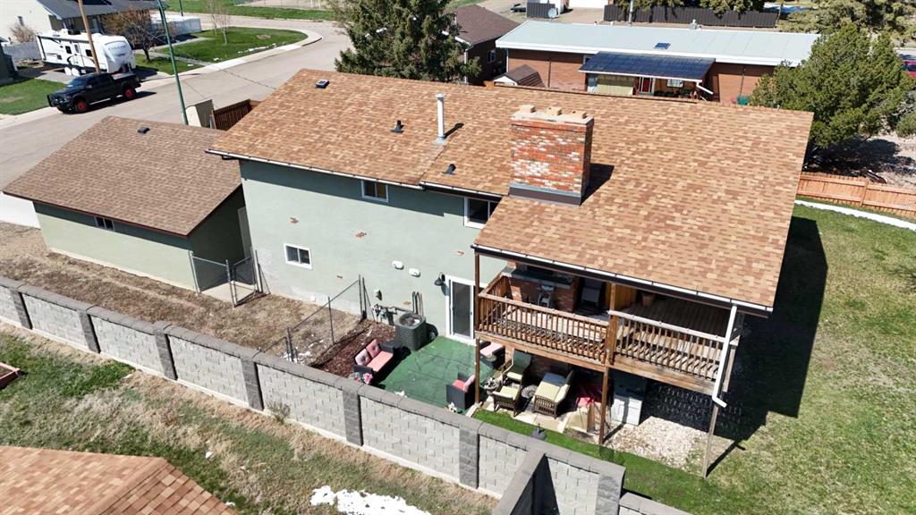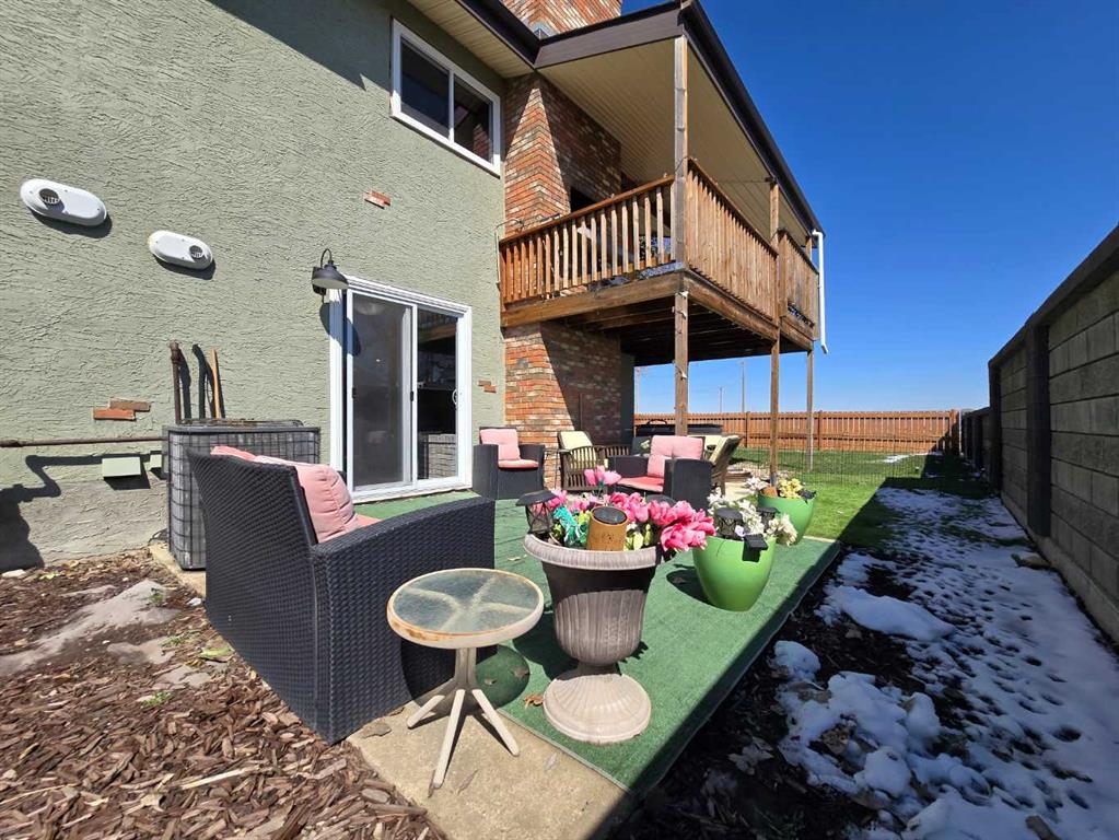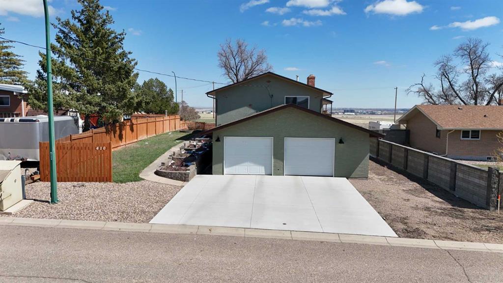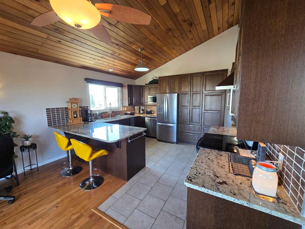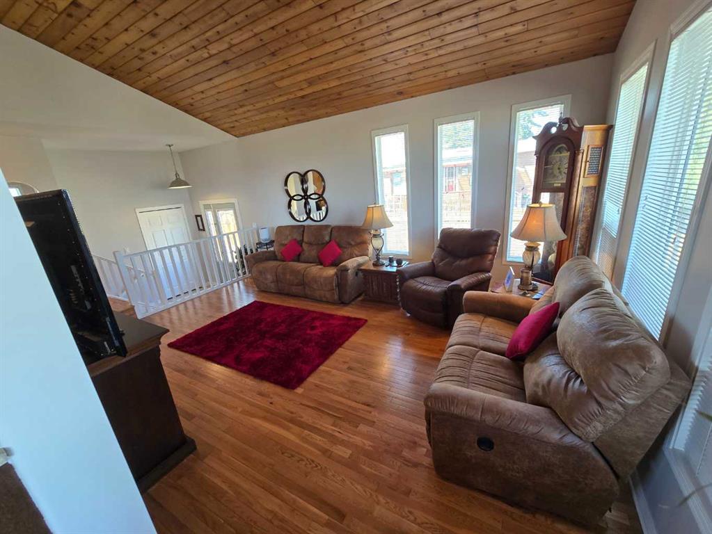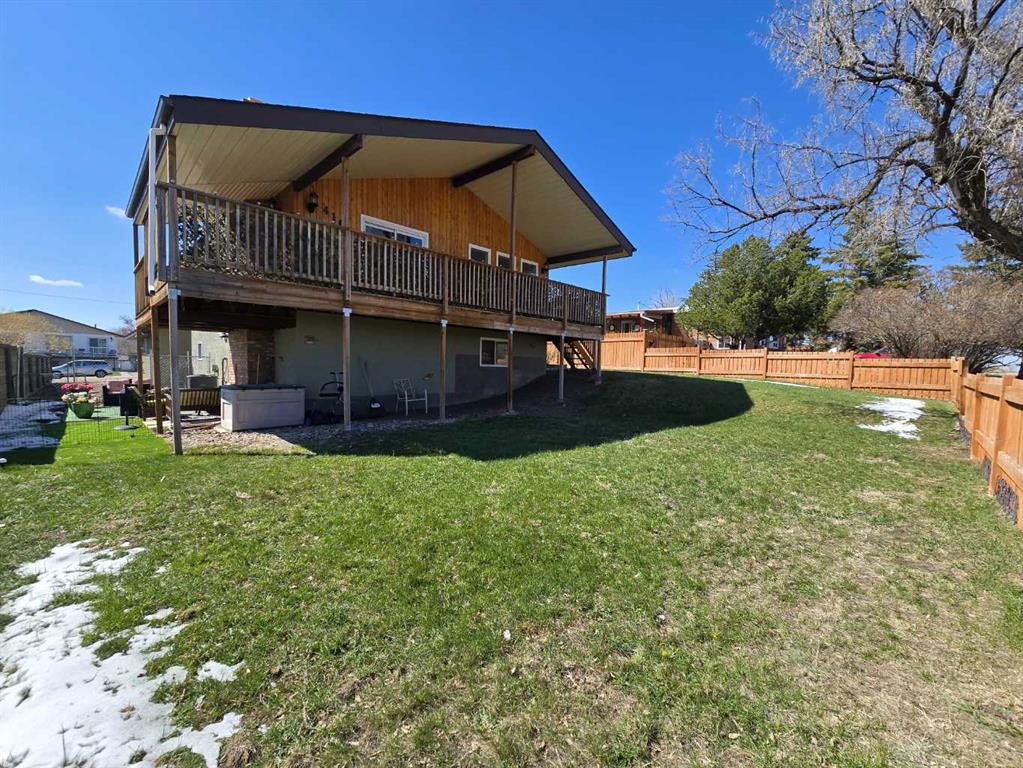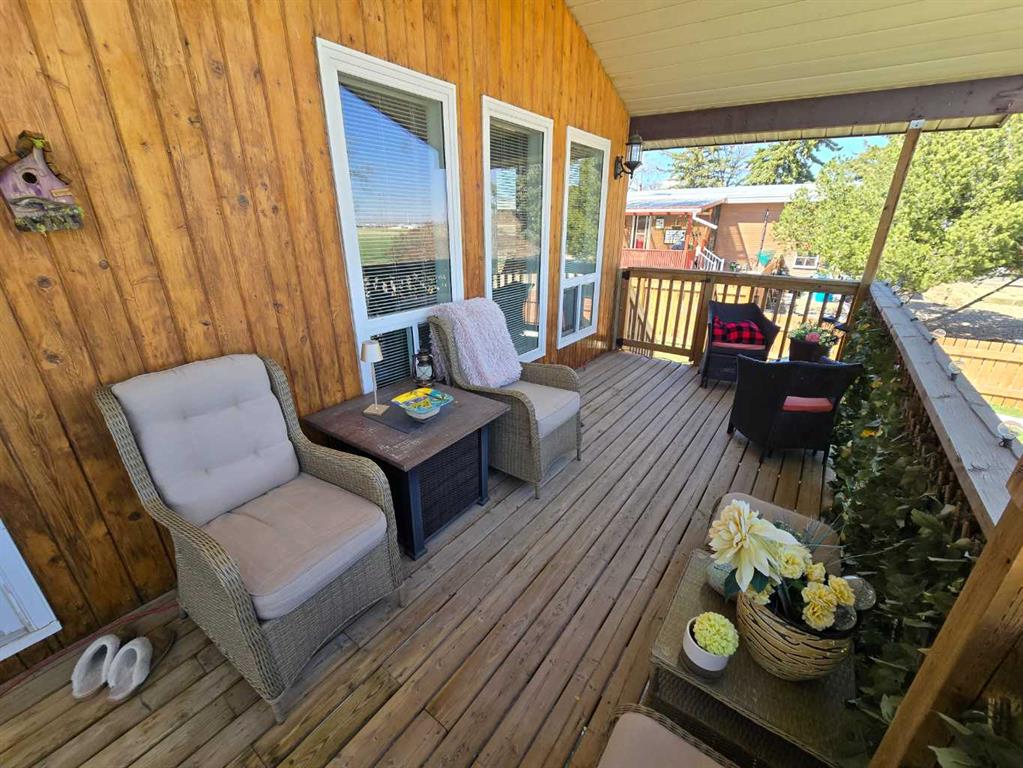 Stunning walkout bungalow with incredible views and standout character! This well-maintained 1979 home offers a bright and open main level with vaulted wood ceilings flowing through the living room, dining area, and kitchen, creating a warm and inviting space full of natural light. The updated kitchen features granite countertops, ample cabinetry, and a functional layout ideal for everyday living and entertaining. The main floor includes two bedrooms and a beautifully updated bathroom complete with a tiled shower and separate soaker tub. The fully developed walkout basement offers excellent flexibility with a second kitchen, spacious family room with brick feature wall, two large bedrooms, and a bathroom with jetted tub. With its own entrance near the garage as well as patio access, this space is perfect for extended family, a mother-in-law setup, or future suite potential. Step outside to a large wrap-around deck spanning the width of the home, complete with a built-in brick fireplace/BBQ—an ideal spot to take in the unobstructed views toward Medicine Hat and beyond, with no neighbours directly in front. Additional features include a 26’ x 28’ double detached garage with finished interior and electric heater, double concrete driveway plus extra parking, underground sprinklers, and a spacious yard. The exterior offers a combination of stucco and wood siding for added character. Additional updates and features include hardwood flooring, a high-efficiency furnace (2024), tankless hot water system (2023), and many vinyl windows, with only a few original aluminum windows remaining. A truly unique property offering space, versatility, and spectacular views—far from cookie-cutter.