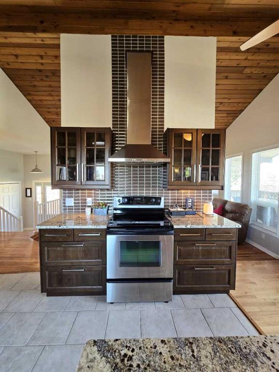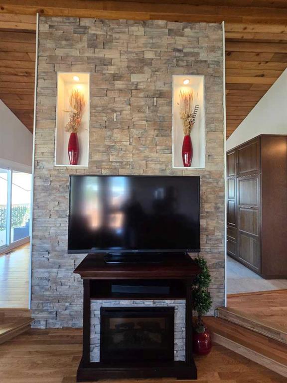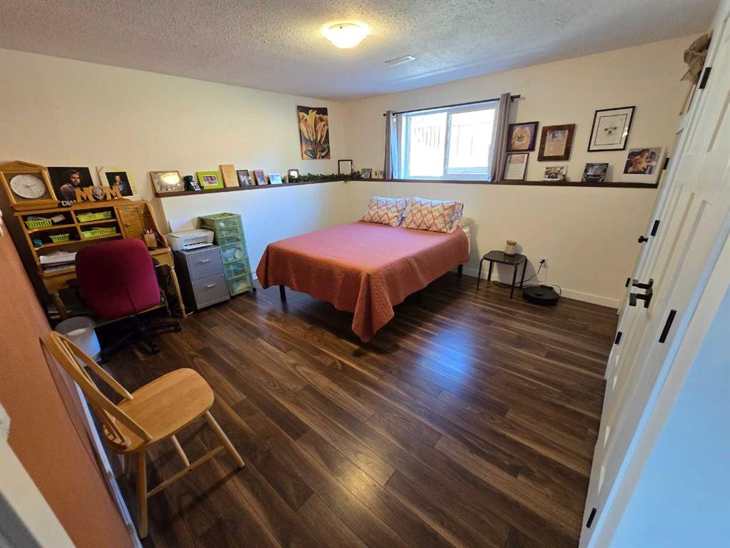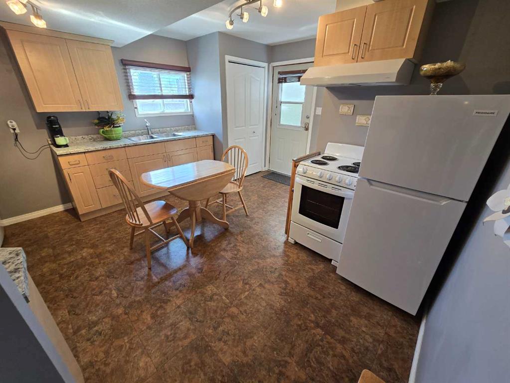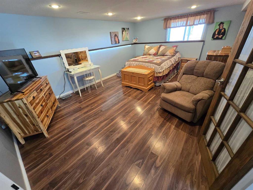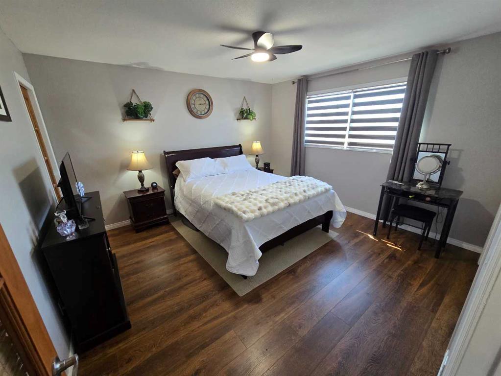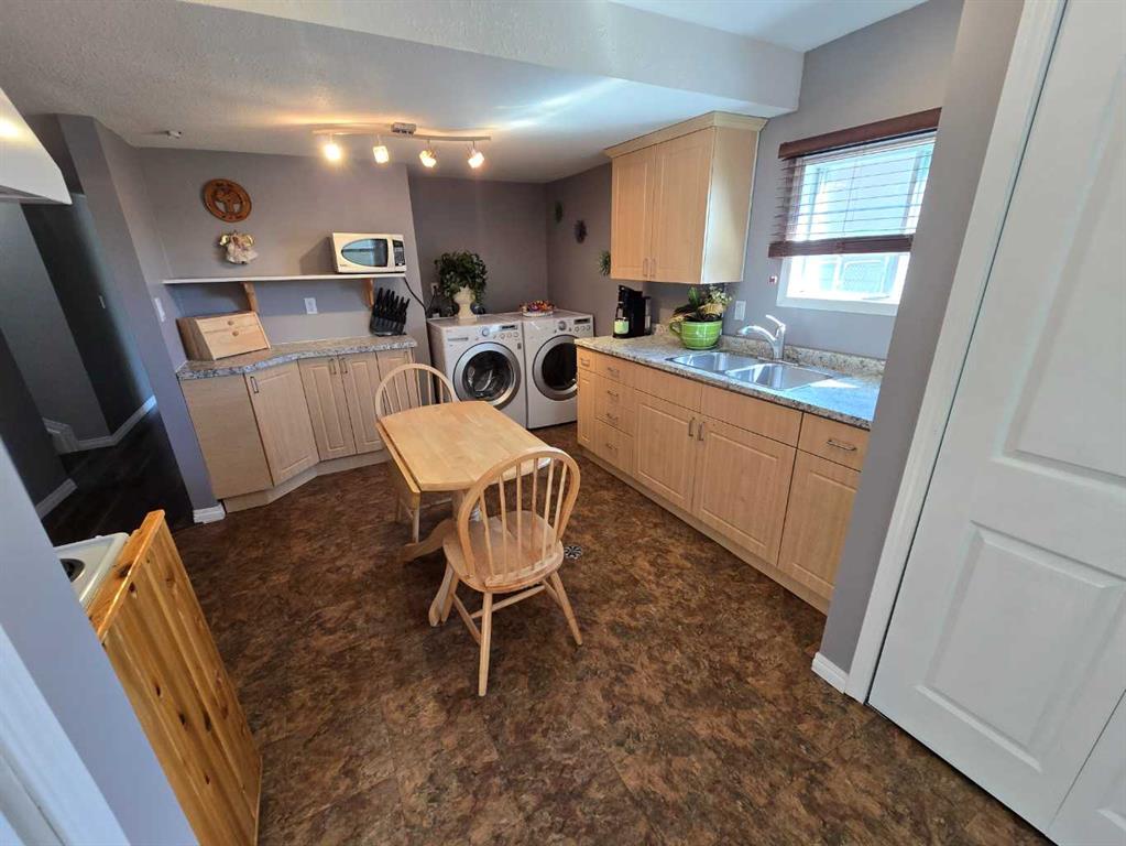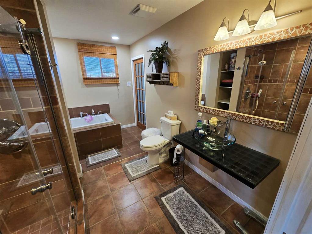 Stunning walkout bungalow with incredible views and standout character! This well-maintained 1979 home offers a bright and open main level with vaulted wood ceilings flowing through the living room, dining area, and kitchen, creating a warm and inviting space full of natural light. The updated kitchen features granite countertops, ample cabinetry, and a functional layout ideal for everyday living and entertaining. The main floor includes two bedrooms and a beautifully updated bathroom complete with a tiled shower and separate soaker tub. The fully developed walkout basement offers excellent flexibility with a second kitchen, spacious family room with brick feature wall, two large bedrooms, and a bathroom with jetted tub. With its own entrance near the garage as well as patio access, this space is perfect for extended family, a mother-in-law setup, or future suite potential. Step outside to a large wrap-around deck spanning the width of the home, complete with a built-in brick fireplace/BBQ—an ideal spot to take in the unobstructed views toward Medicine Hat and beyond, with no neighbours directly in front. Additional features include a 26’ x 28’ double detached garage with finished interior and electric heater, double concrete driveway plus extra parking, underground sprinklers, and a spacious yard. The exterior offers a combination of stucco and wood siding for added character. Additional updates and features include hardwood flooring, a high-efficiency furnace (2024), tankless hot water system (2023), and many vinyl windows, with only a few original aluminum windows remaining. A truly unique property offering space, versatility, and spectacular views—far from cookie-cutter.