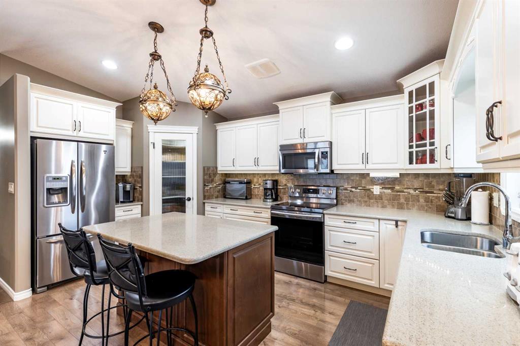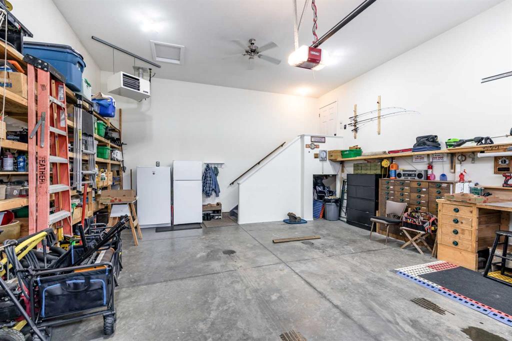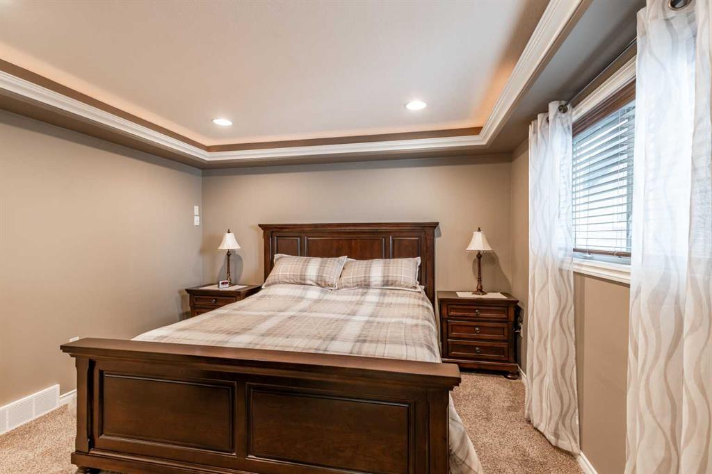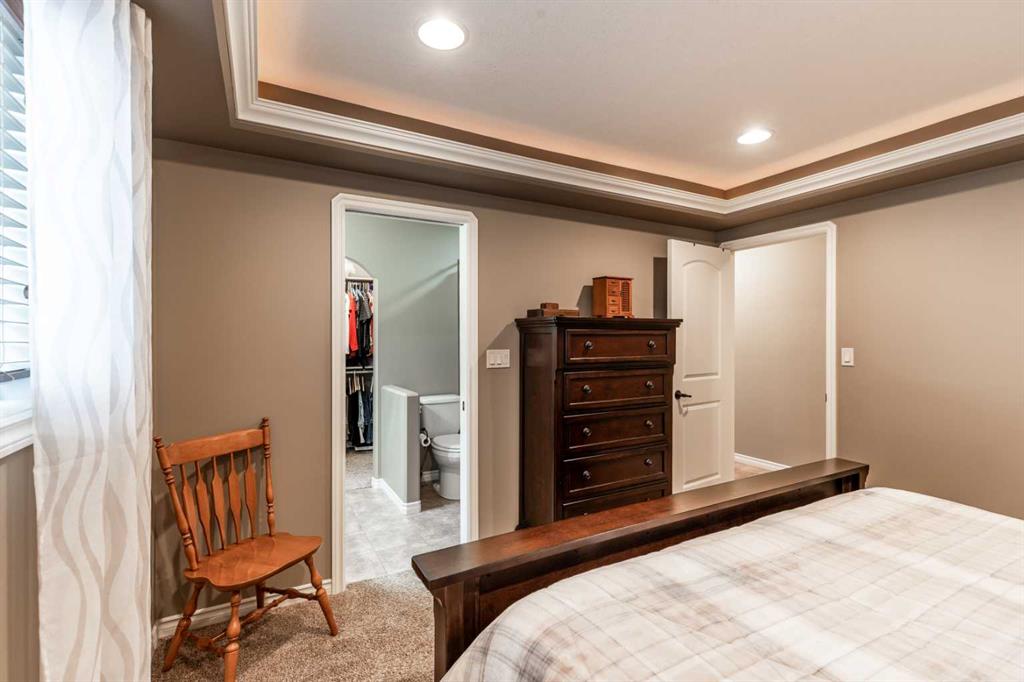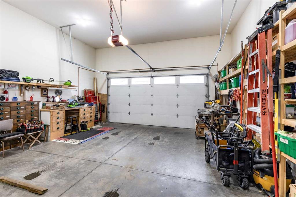 The primary bedroom features a tray ceiling with ambient lighting, a walk-in closet, and a 4-piece ensuite. There’s also a second bedroom and a 4-piece bathroom on the main floor, along with main-floor laundry. From the hallway, you’ll find access to the attached garage, which is a standout feature with its 13-foot ceilings, 220V power, heat, and excellent storage options.