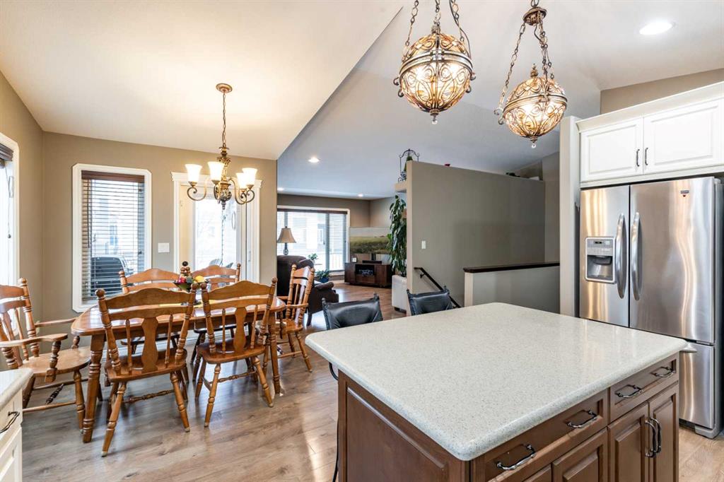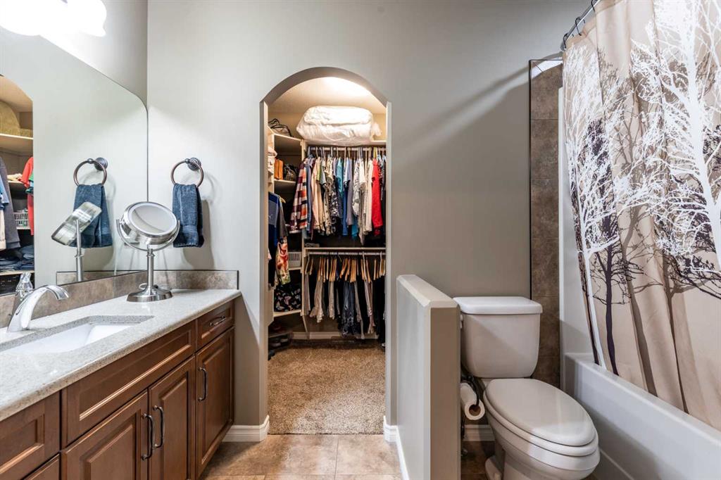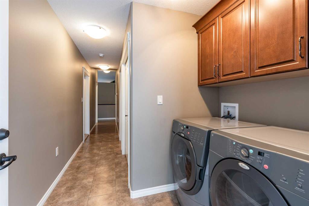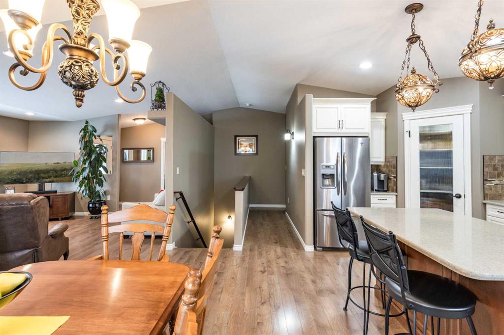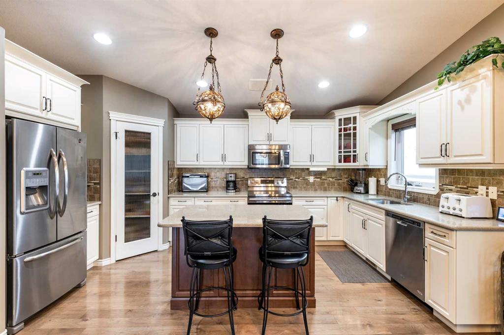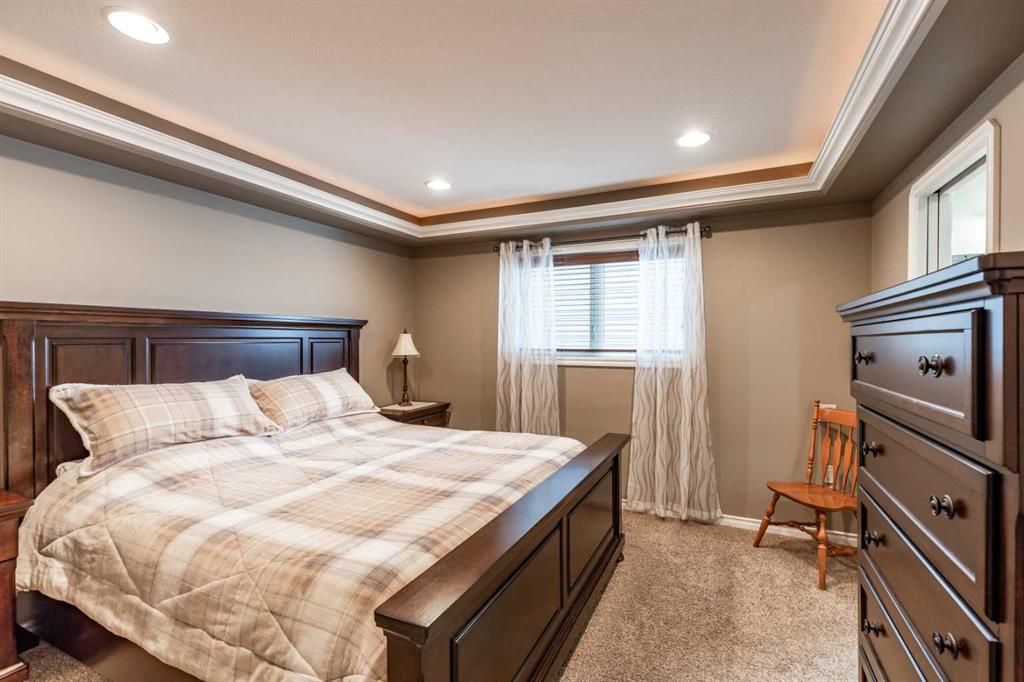 The primary bedroom features a tray ceiling with ambient lighting, a walk-in closet, and a 4-piece ensuite. There’s also a second bedroom and a 4-piece bathroom on the main floor, along with main-floor laundry. From the hallway, you’ll find access to the attached garage, which is a standout feature with its 13-foot ceilings, 220V power, heat, and excellent storage options.