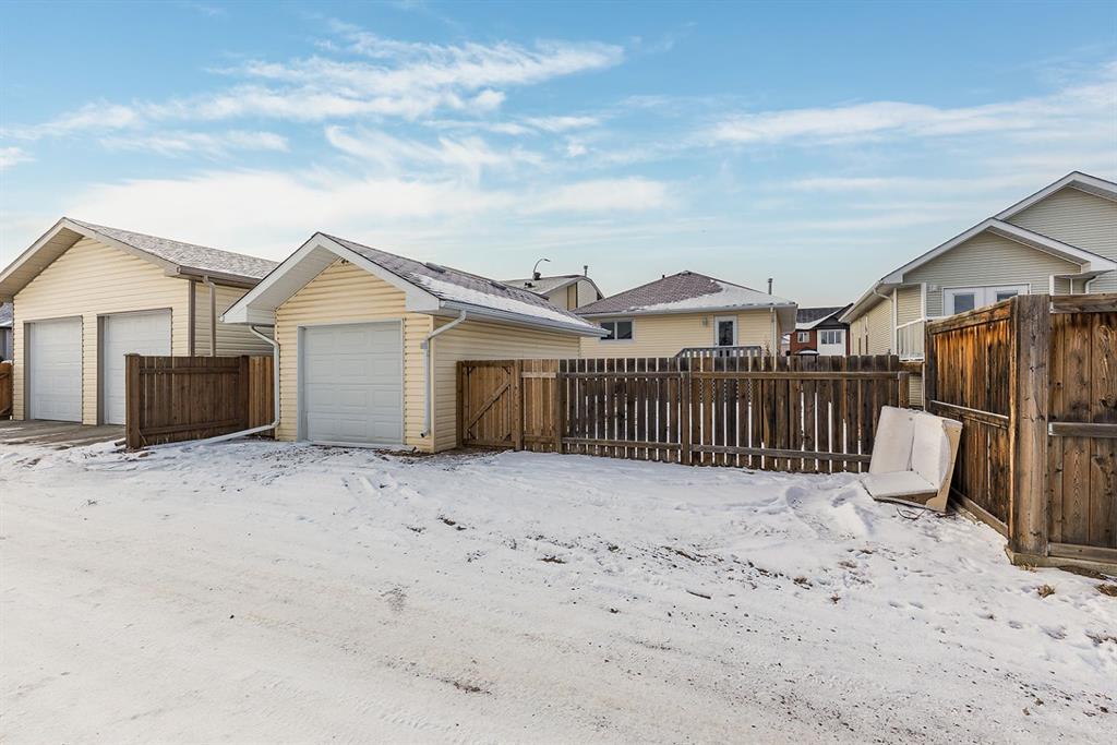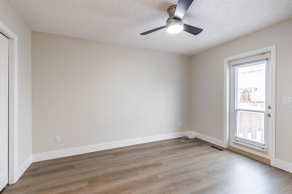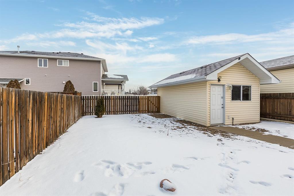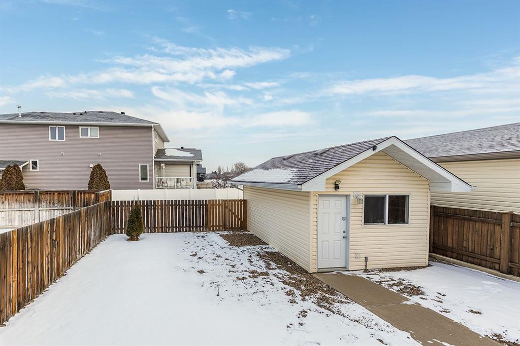 Two bedrooms are located on the main level, including one with direct access to the rear patio—ideal for enjoying morning coffee or easy backyard access. A full 4-piece bathroom completes the main floor. Step outside to enjoy the low-maintenance, xeriscaped yard and relax on the welcoming covered front porch. A single detached garage provides added convenience and storage.