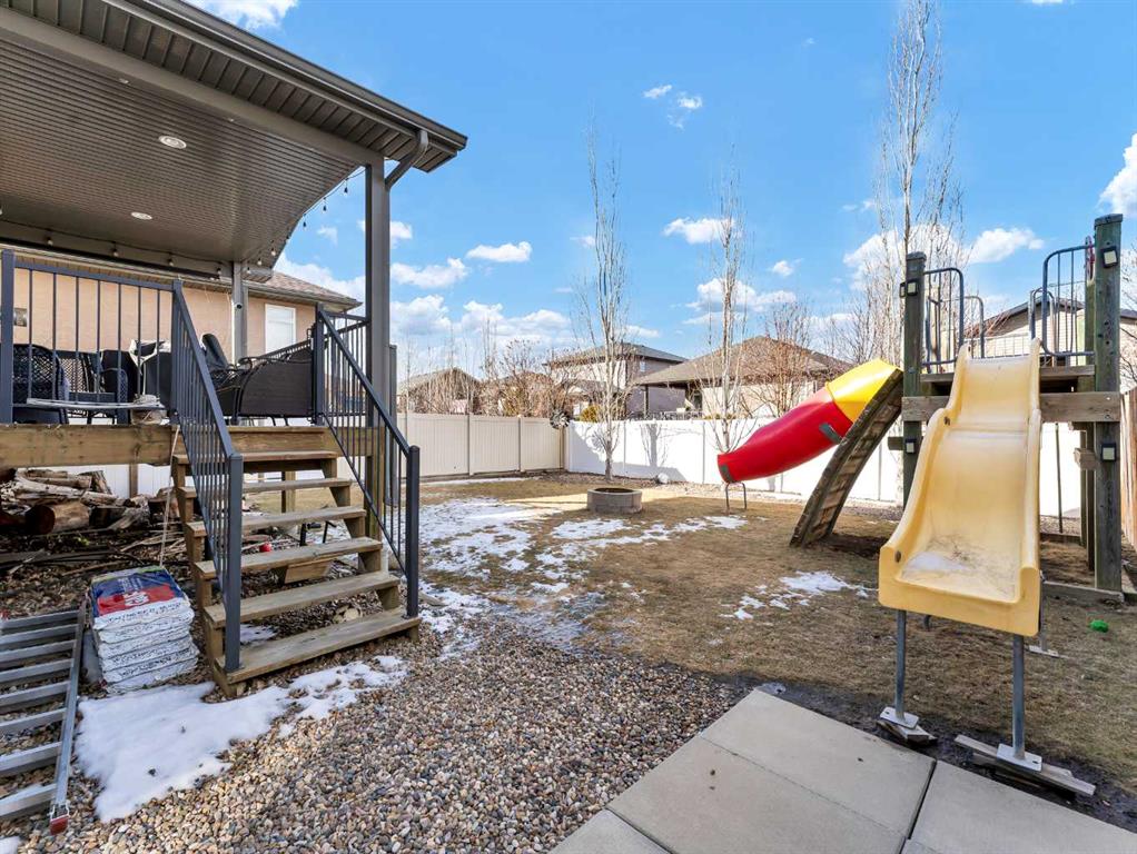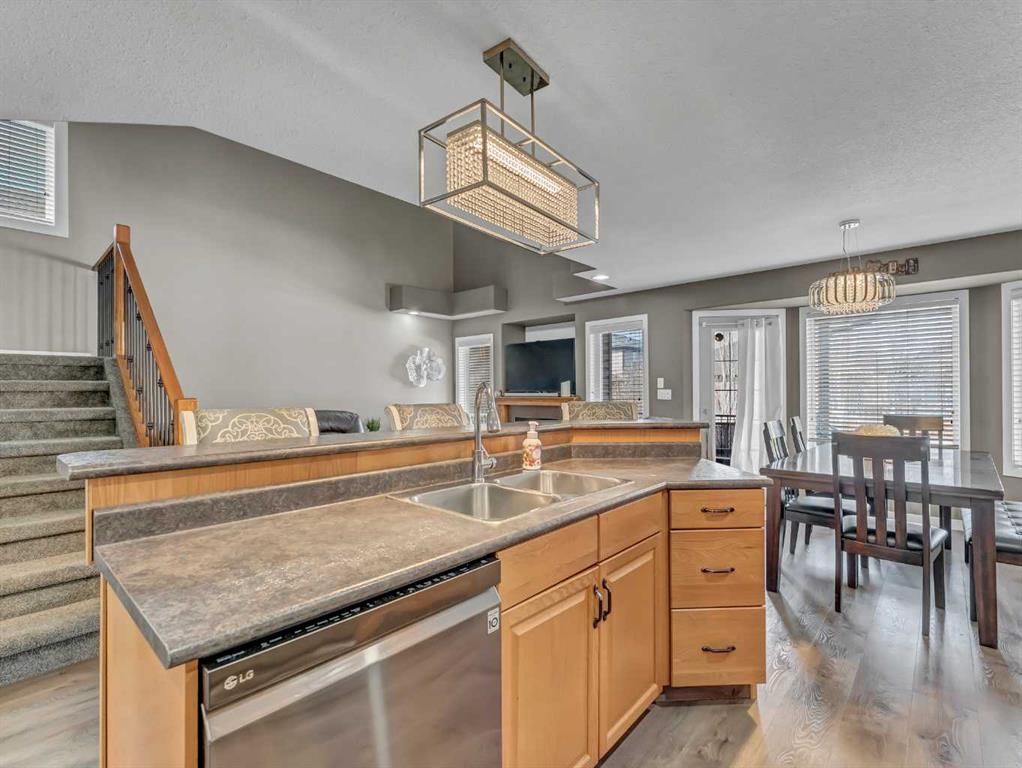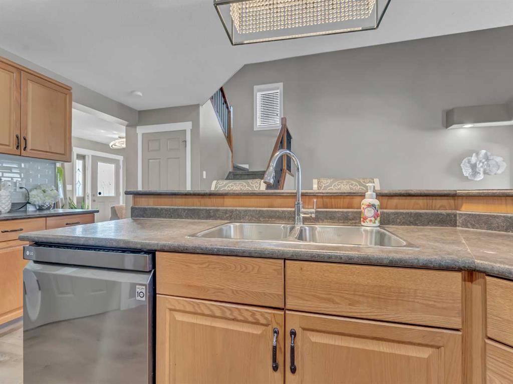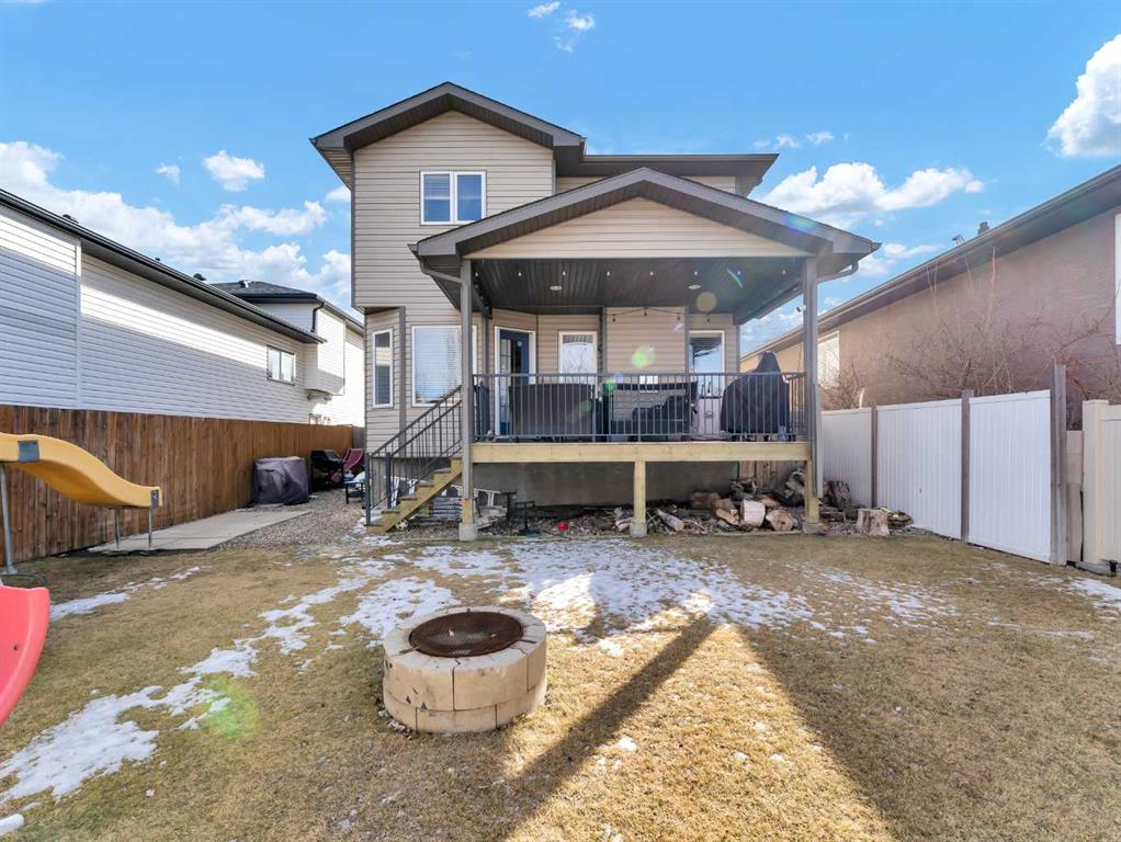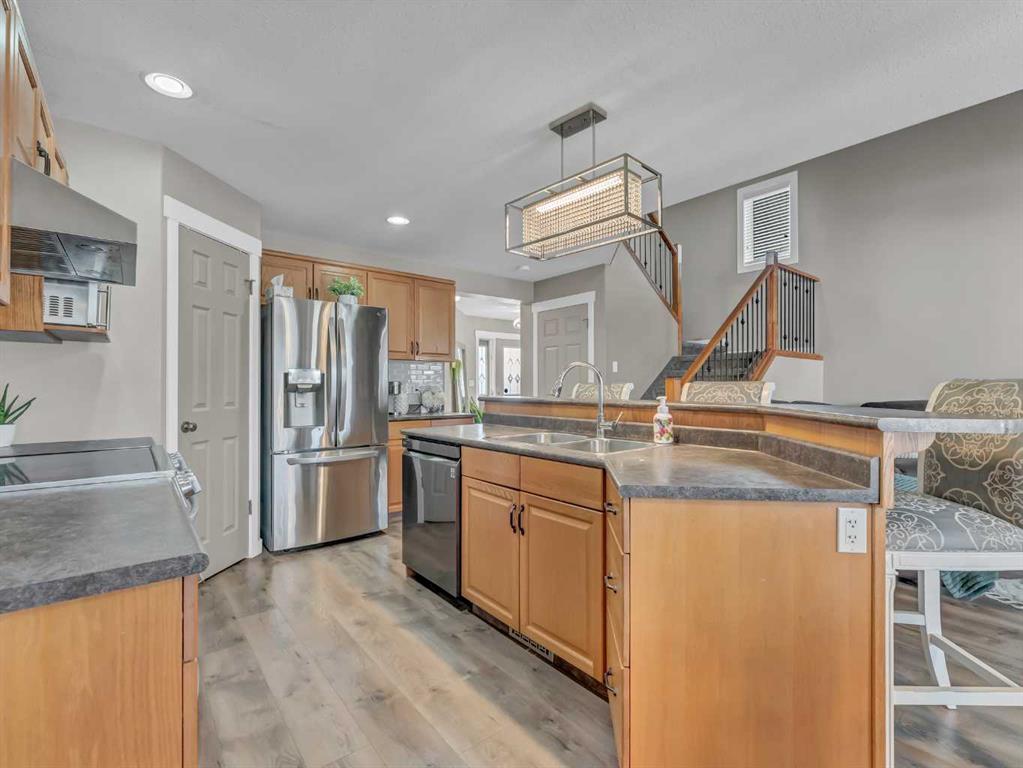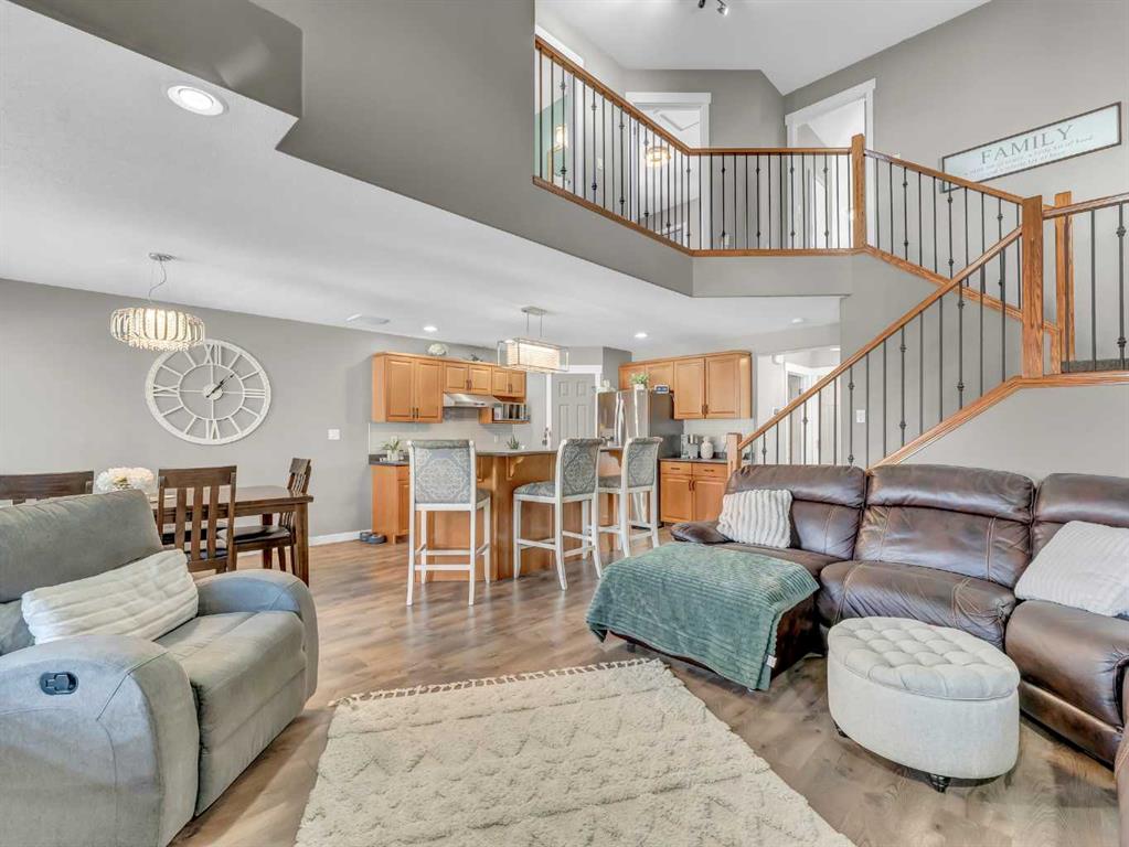 Welcome to this move-in ready 2-storey home offering a functional layout, great living space, and room to grow! Featuring newer flooring, newer appliances and a new roof (2024)! The main floor features an open-concept design with a spacious kitchen complete with oak cabinetry, newer stainless steel appliances, a corner pantry, and a large centre island with eat-at breakfast bar—perfect for family life and entertaining. The generous dining area easily accommodates a full-sized table and flows into the bright living room, where you’ll love the gas fireplace, soaring two-storey ceilings, and abundance of natural light. A convenient 2-piece bathroom, main floor laundry, and access to the double attached garage complete this level. Upstairs you’ll find three bedrooms, including a comfortable primary suite with a walk-in closet and a 4-piece ensuite featuring a soaker tub and separate shower, plus a full 4-piece main bathroom for the family. Step outside to enjoy the covered deck and fully fenced, landscaped backyard—ideal for relaxing or hosting summer BBQs. The unfinished lower level offers endless potential for future development to suit your needs. A fantastic opportunity to own a well-maintained family home in a great location—just move in and enjoy!